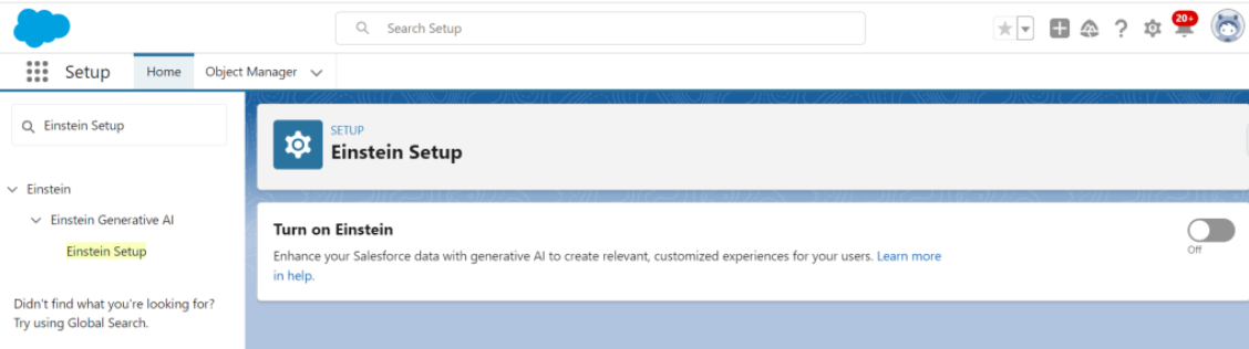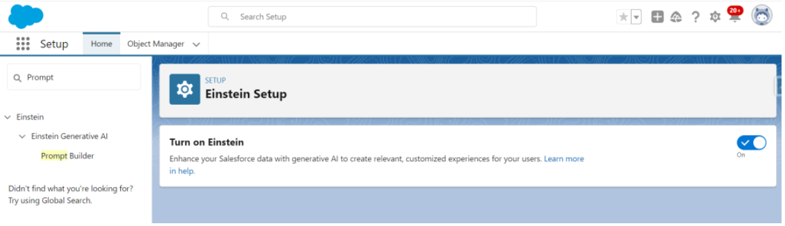 If you are searching for Prompt Builder in your Org, and you are unable to find it. If you are having an experience like the screenshot below, you might not have turned on Einstein in your Org.